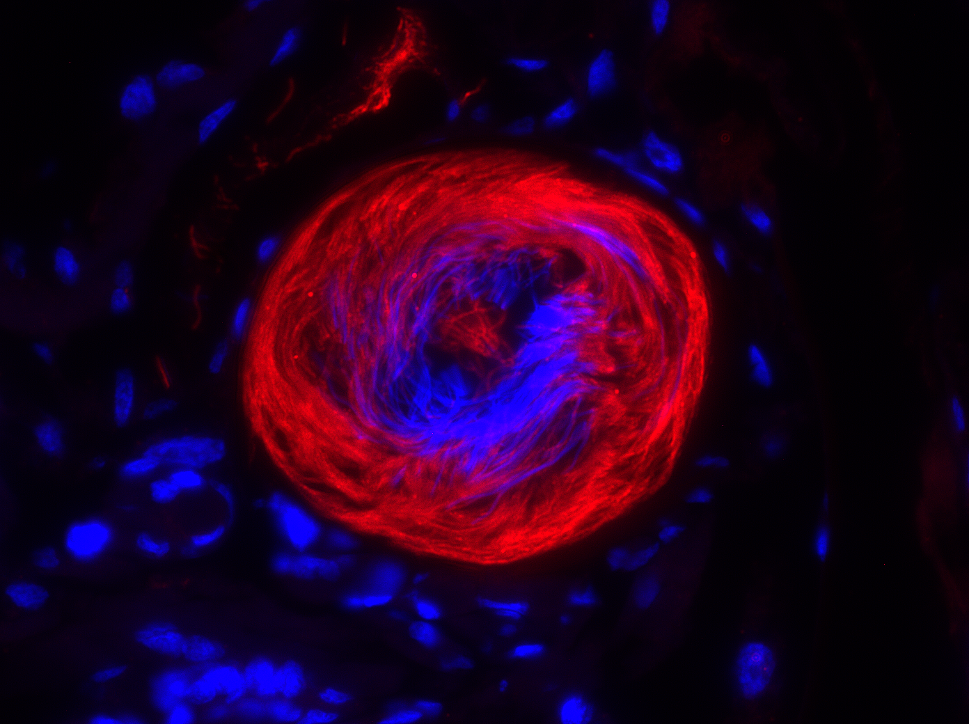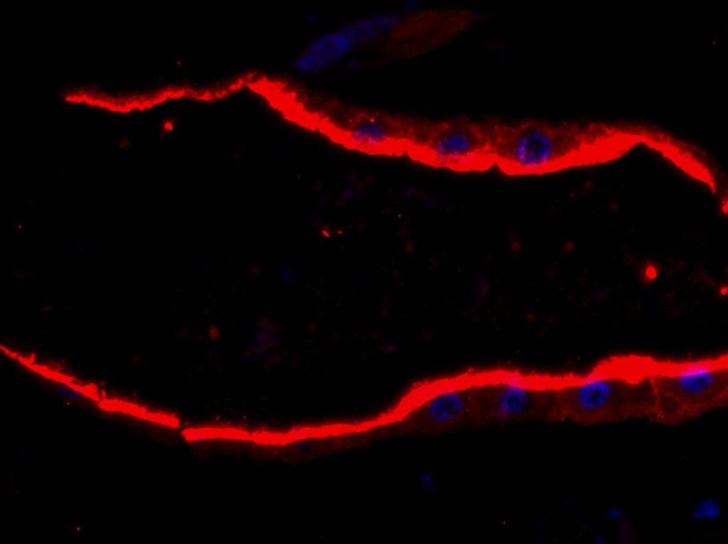 a thin section through the head of a mosquito showing AMT, DAPI, and H+-pump staining to different organs