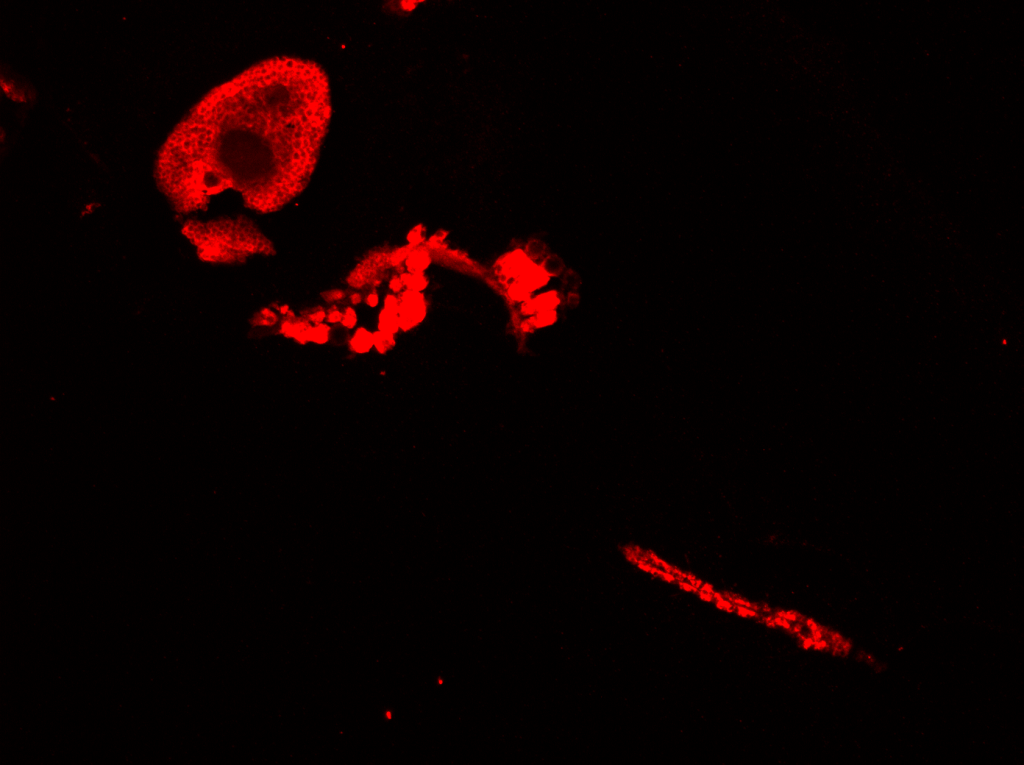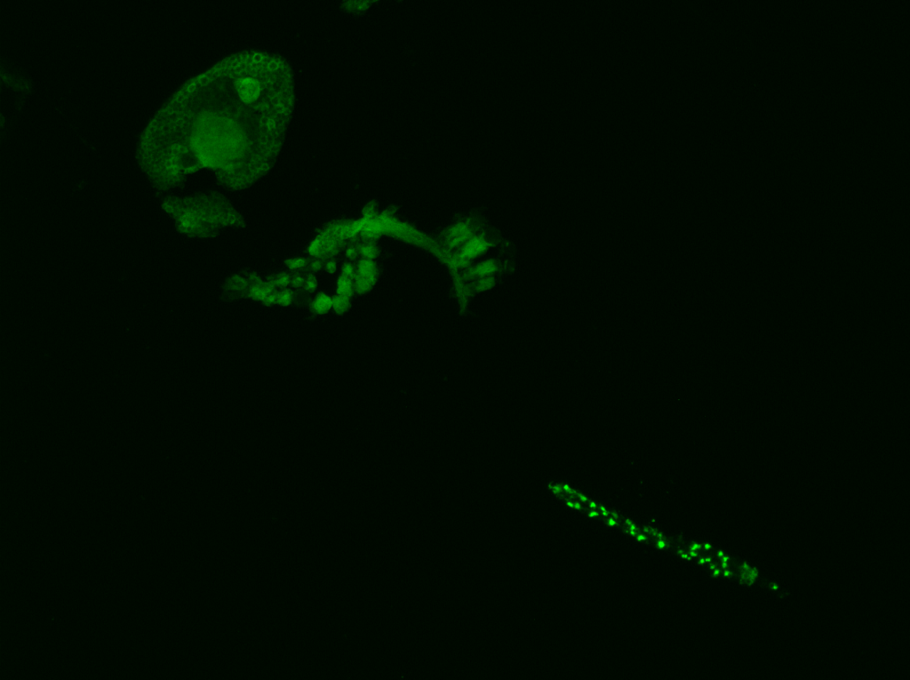 ammonium transporters in the liver-like fat body cells (adipocytes) likely facilitate important mosquito energetics and metabolic processes. Use the slider below to view two different gene isoforms in these cells!